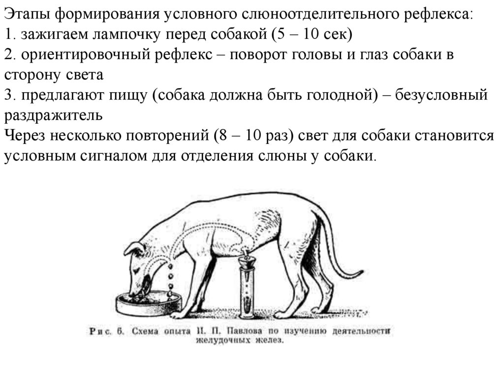 Этапы формирования условного слюноотделительного рефлекса:1. зажигаем лампочку перед собакой (5 – 10 сек)