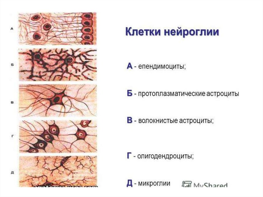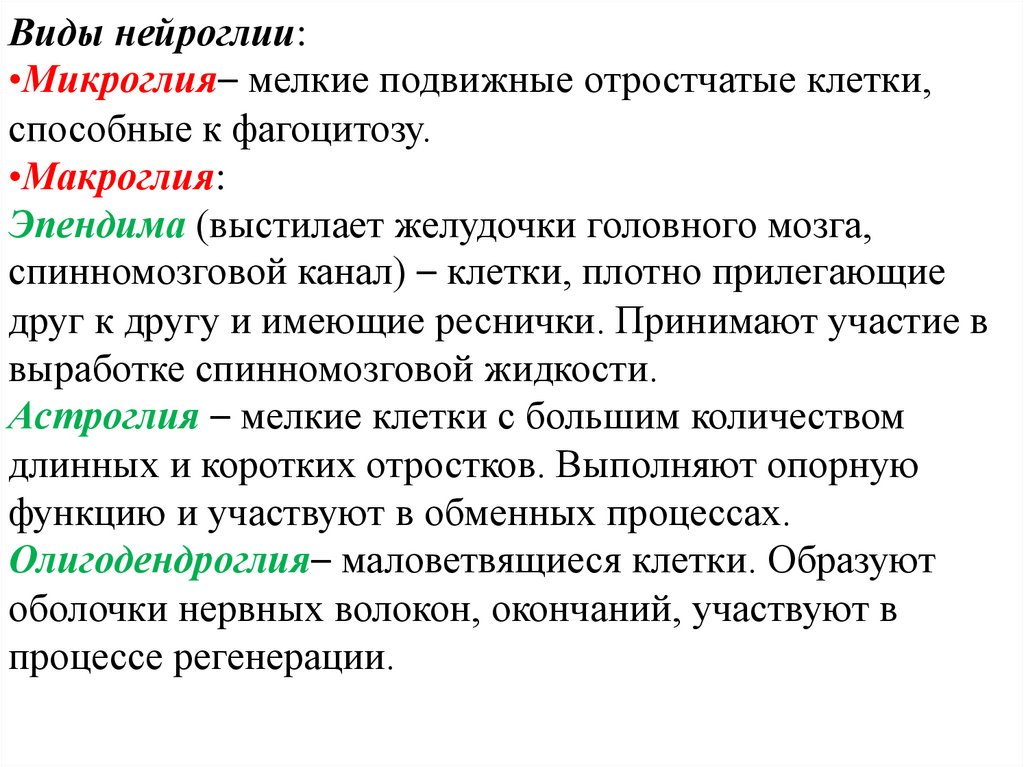 Виды нейроглии:•Микроглия– мелкие подвижные отростчатые клетки,