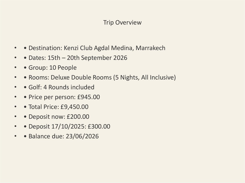 Trip Overview• Destination: Kenzi Club Agdal Medina, Marrakech