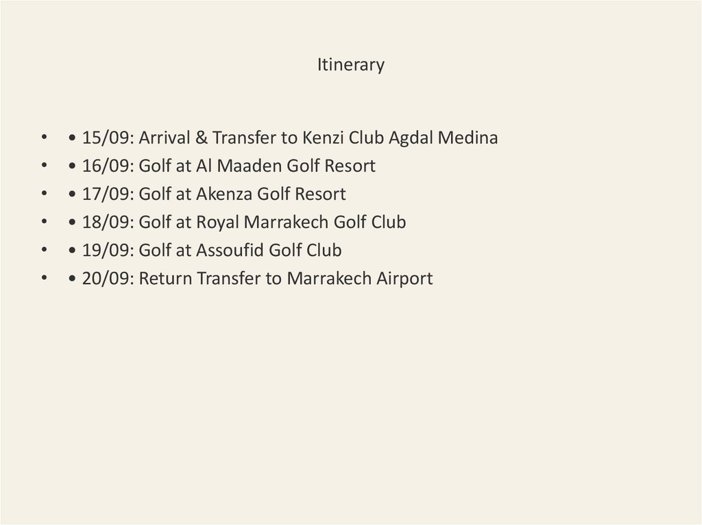 Itinerary• 15/09: Arrival & Transfer to Kenzi Club Agdal Medina