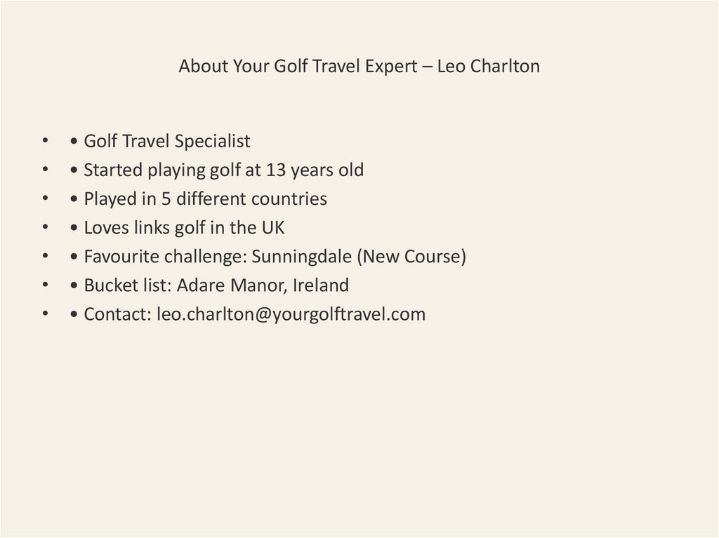 About Your Golf Travel Expert – Leo Charlton• Golf Travel Specialist