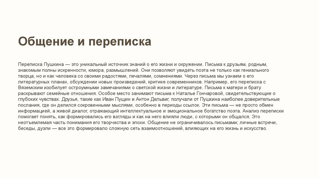 Общение и перепискаПереписка Пушкина — это уникальный источник знаний о его жизни и окружении. Письма к друзьям, родным,
