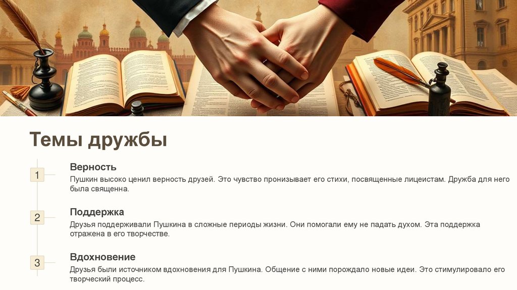 Друзья поддерживали Пушкина в сложные периоды жизни. Они помогали ему не падать духом. Эта поддержка
