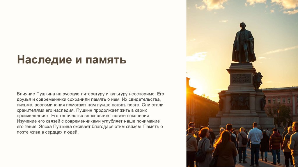 Наследие и памятьВлияние Пушкина на русскую литературу и культуру неоспоримо. Его