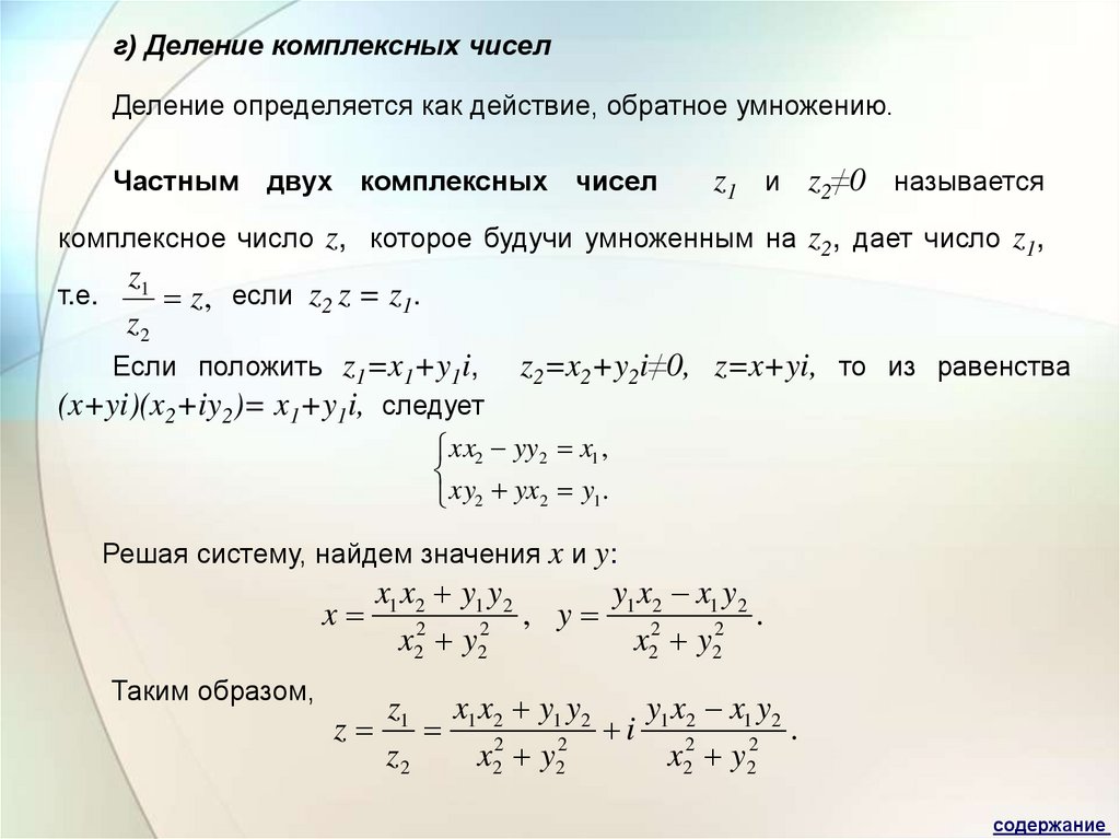 г) Деление комплексных чиселДеление определяется как действие, обратное умножению.