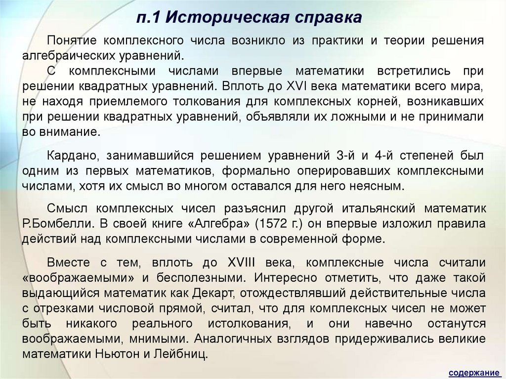 п.1 Историческая справкаПонятие комплексного числа возникло из практики и теории решения