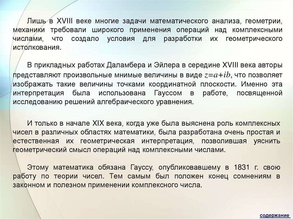 Лишь в XVIII веке многие задачи математического анализа, геометрии,механики требовали широкого применения операций над комплексными