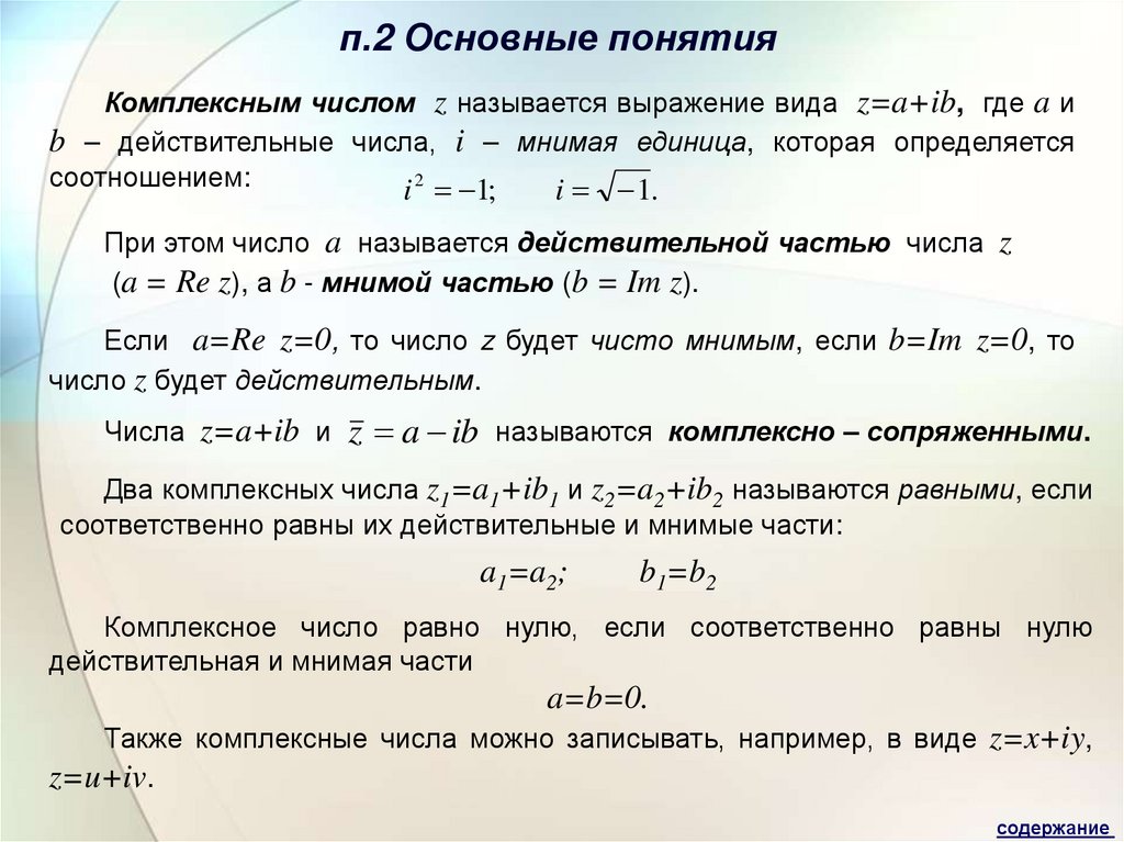 п.2 Основные понятияКомплексным числом z называется выражение вида z=a+ib, где a и