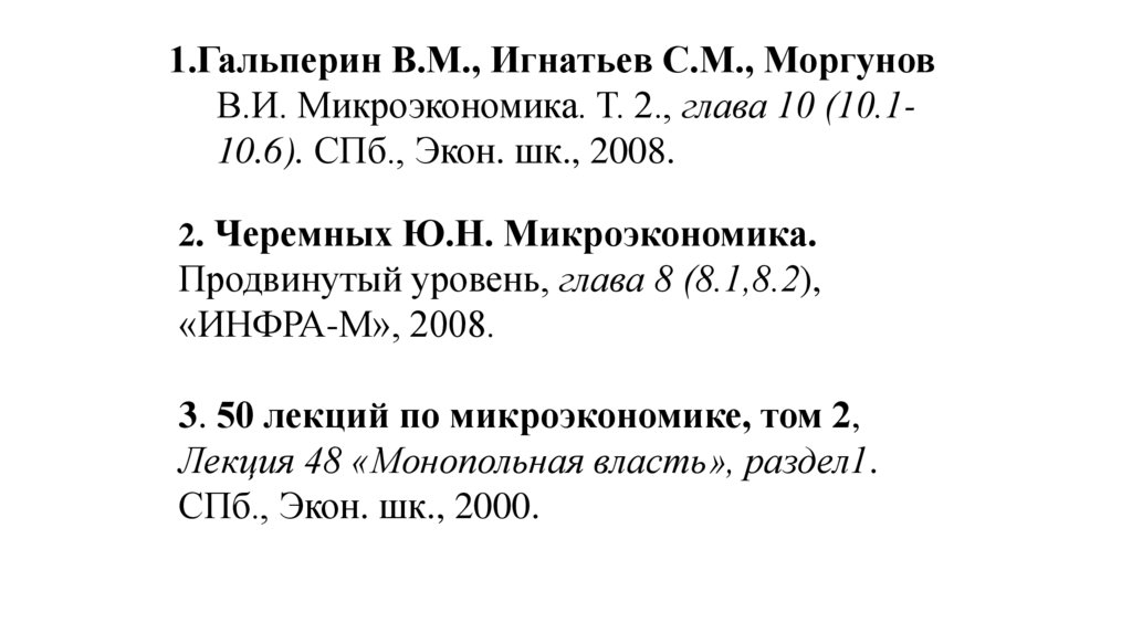 1.Гальперин В.М., Игнатьев С.М., МоргуновВ.И. Микроэкономика. Т. 2., глава 10 (10.110.6). СПб., Экон. шк., 2008.