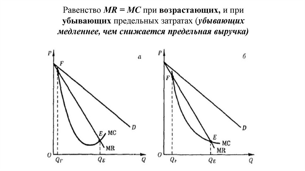 Равенство MR = МС при возрастающих, и приубывающих предельных затратах (убывающих