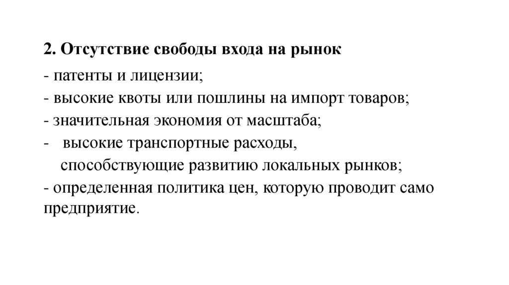 2. Отсутствие свободы входа на рынок- патенты и лицензии;