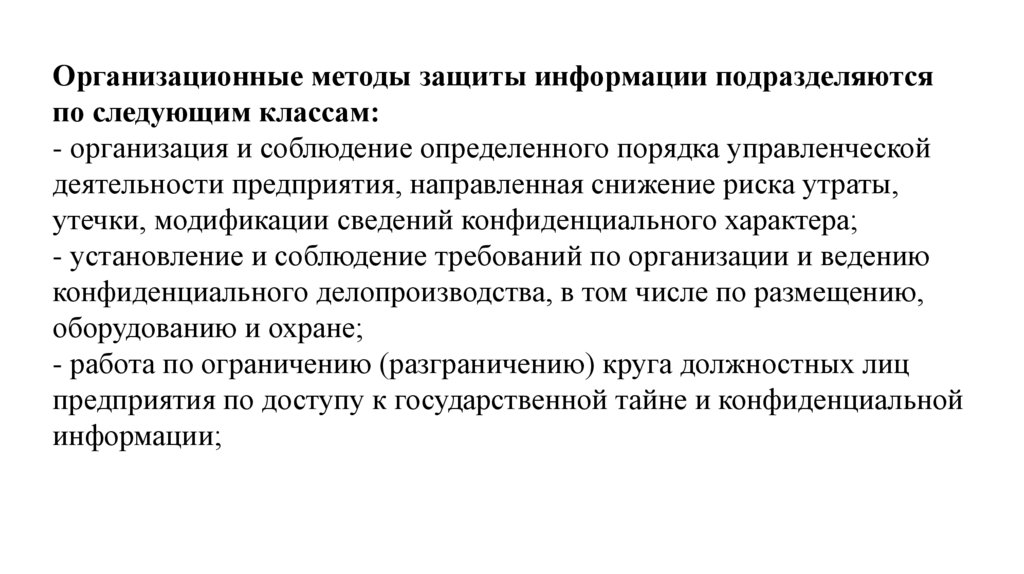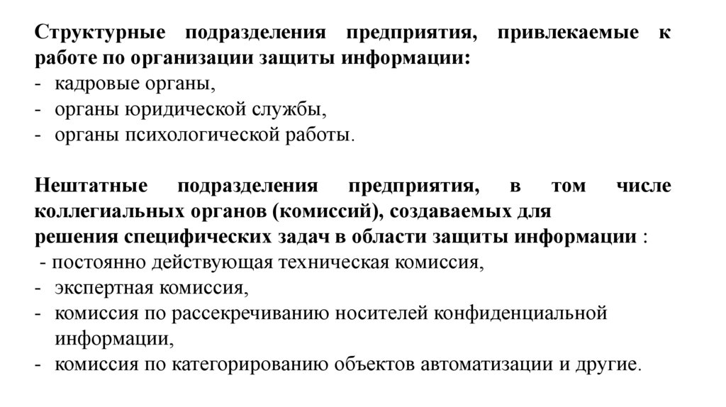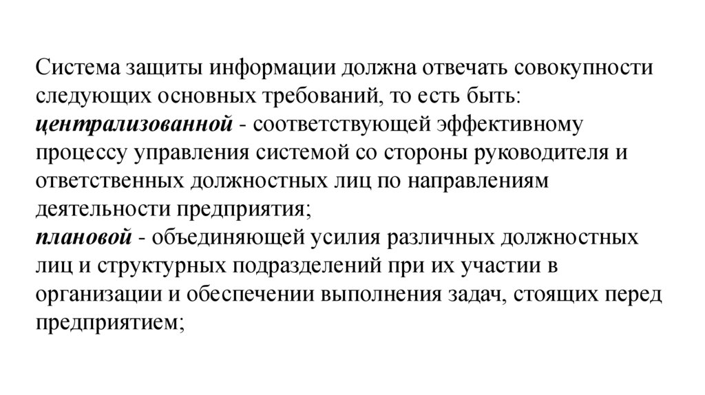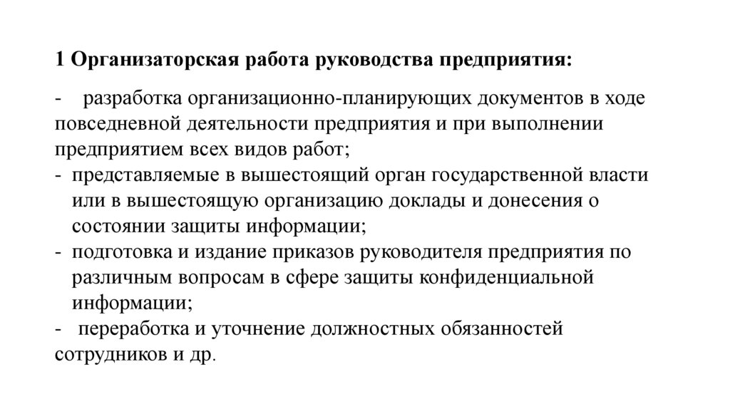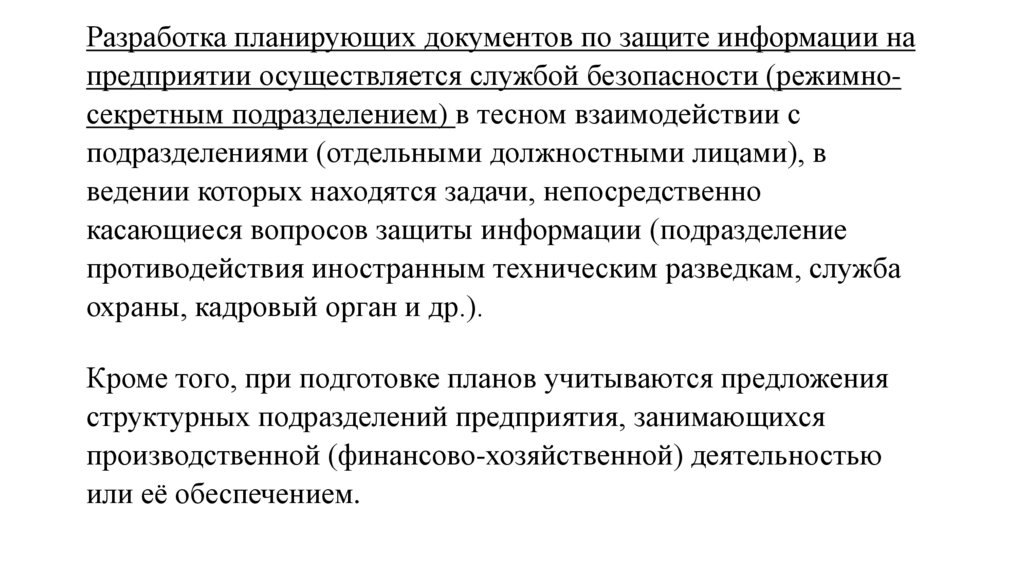 Разработка планирующих документов по защите информации напредприятии осуществляется службой безопасности (режимносекретным подразделением) в тесном взаимодействии с