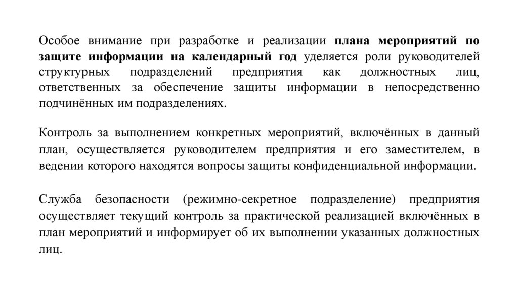 Особое внимание при разработке и реализации плана мероприятий позащите информации на календарный год уделяется роли руководителей