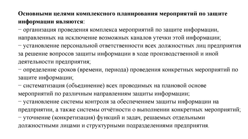 Основными целями комплексного планирования мероприятий по защитеинформации являются: