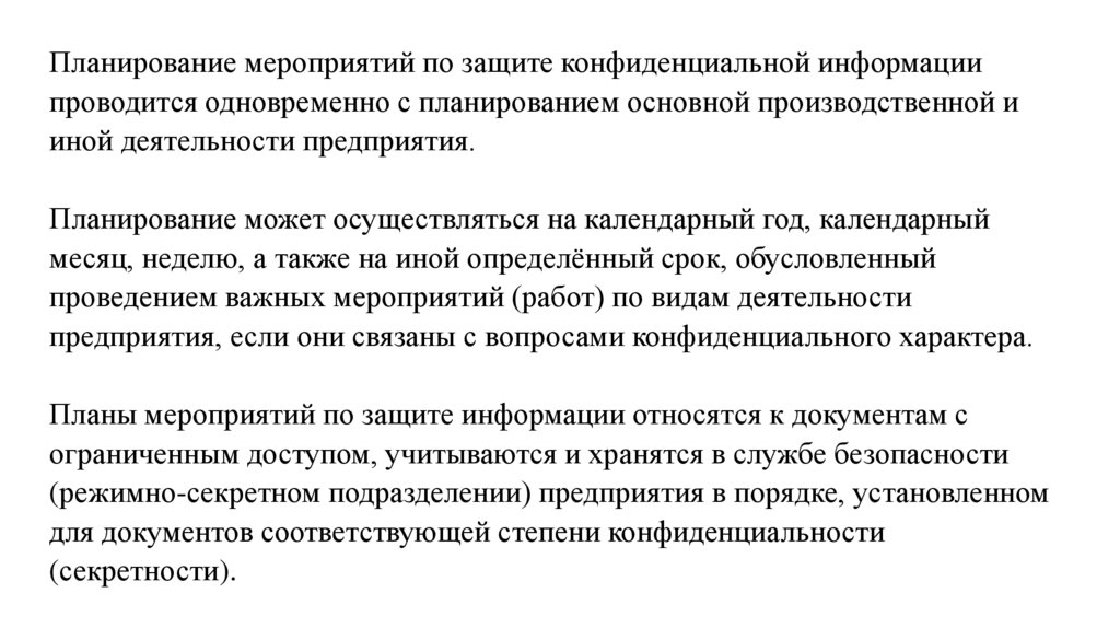 Планирование мероприятий по защите конфиденциальной информациипроводится одновременно с планированием основной производственной и