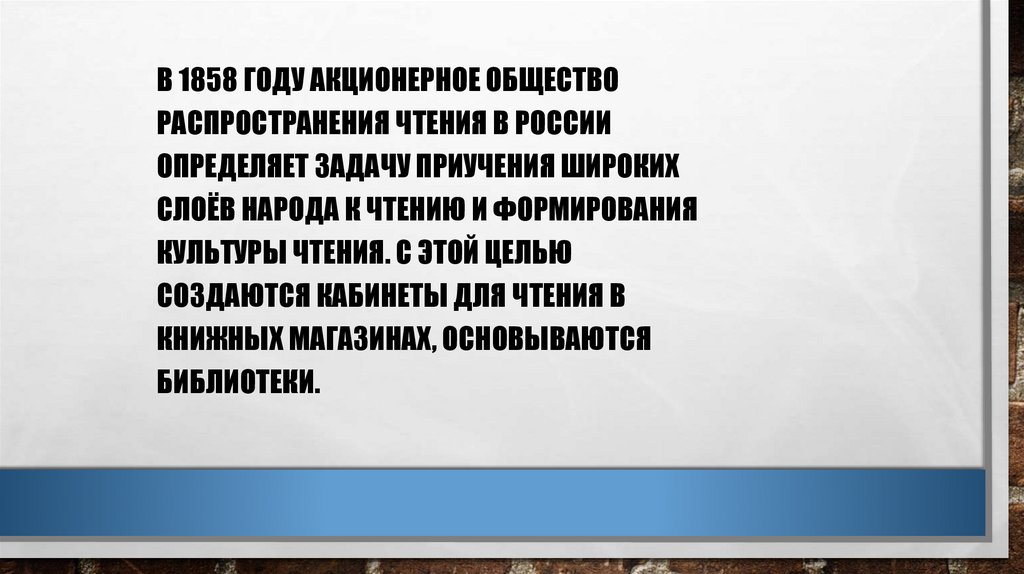В 1858 ГОДУ АКЦИОНЕРНОЕ ОБЩЕСТВОРАСПРОСТРАНЕНИЯ ЧТЕНИЯ В РОССИИ