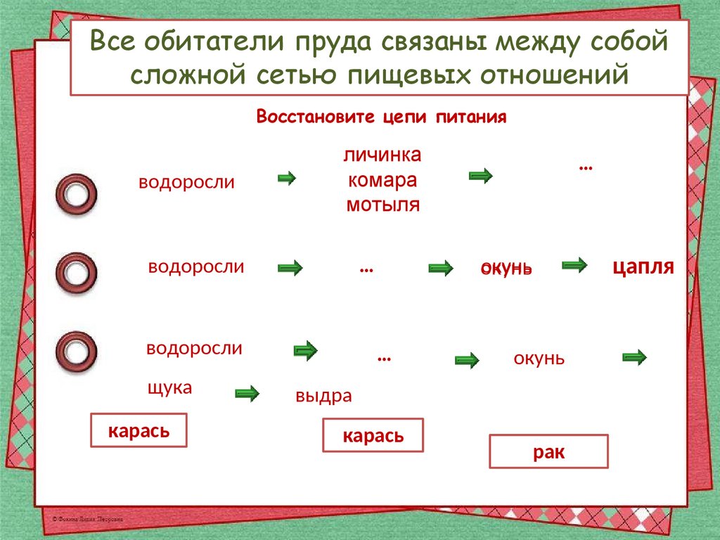 Все обитатели пруда связаны между собойсложной сетью пищевых отношений