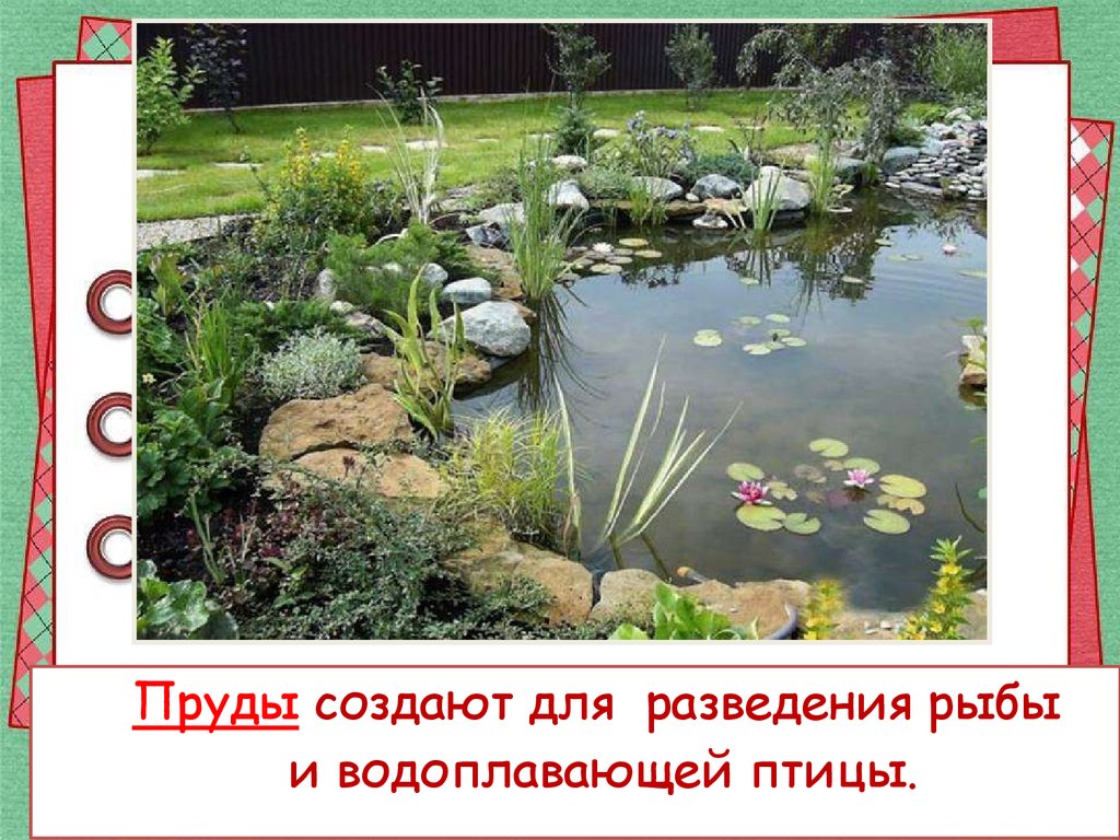 Пруды создают для разведения рыбыи водоплавающей птицы.