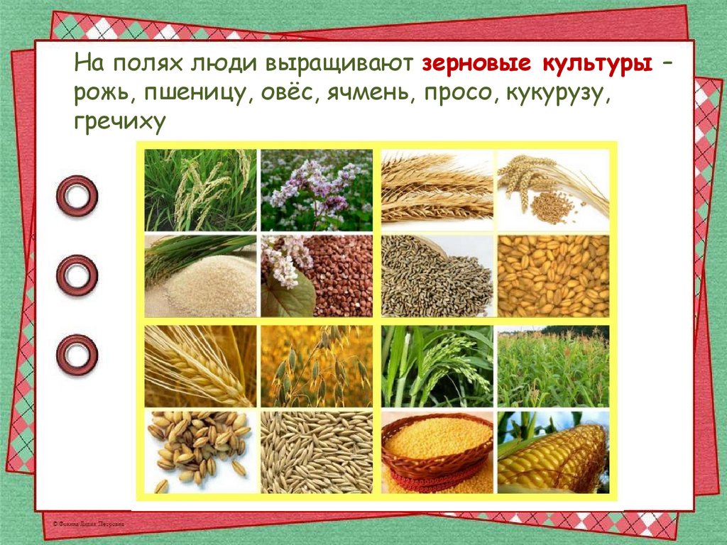 На полях люди выращивают зерновые культуры –рожь, пшеницу, овёс, ячмень, просо, кукурузу,