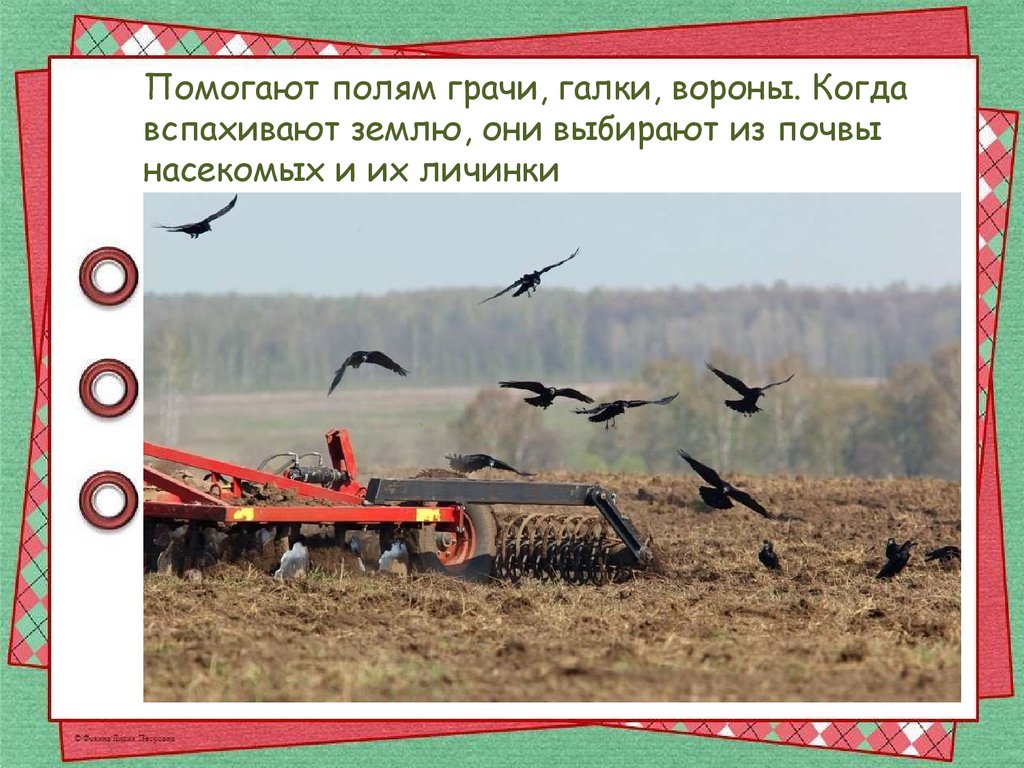 Помогают полям грачи, галки, вороны. Когдавспахивают землю, они выбирают из почвы
