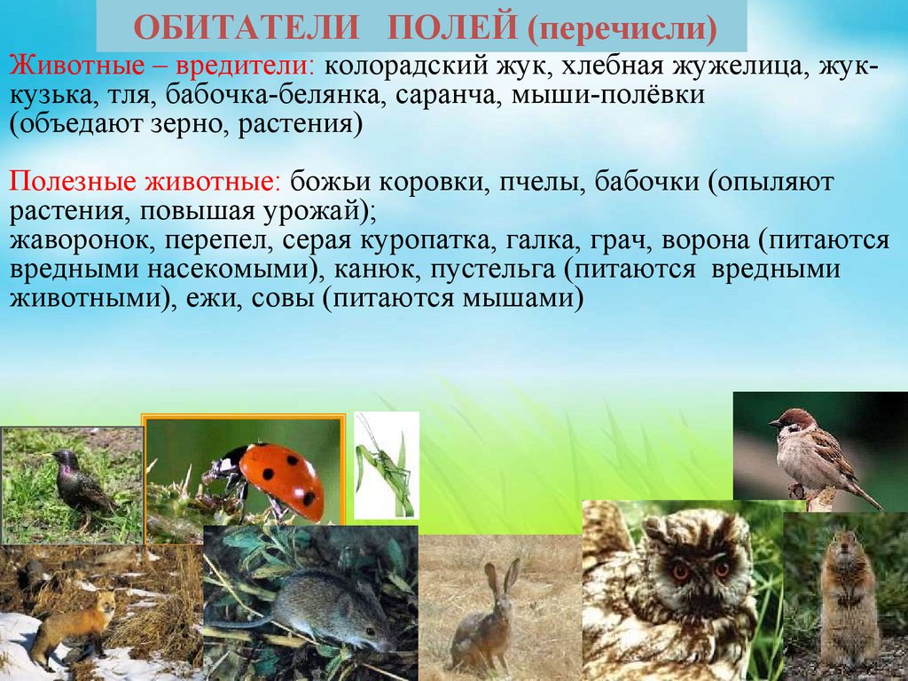ОБИТАТЕЛИ ПОЛЕЙ (перечисли)Животные – вредители: колорадский жук, хлебная жужелица, жуккузька, тля, бабочка-белянка, саранча, мыши-полёвки