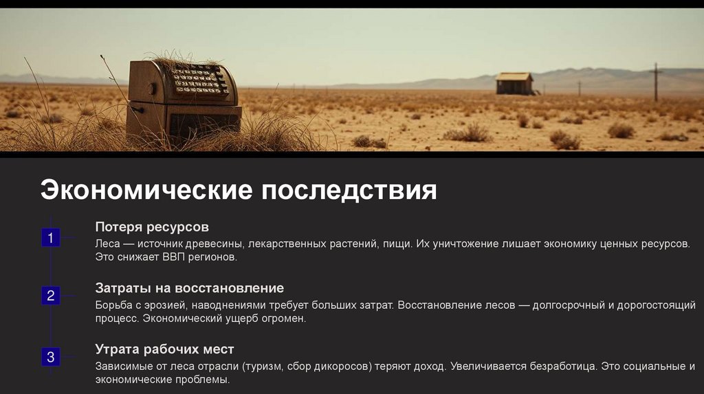 Леса — источник древесины, лекарственных растений, пищи. Их уничтожение лишает экономику ценных ресурсов.