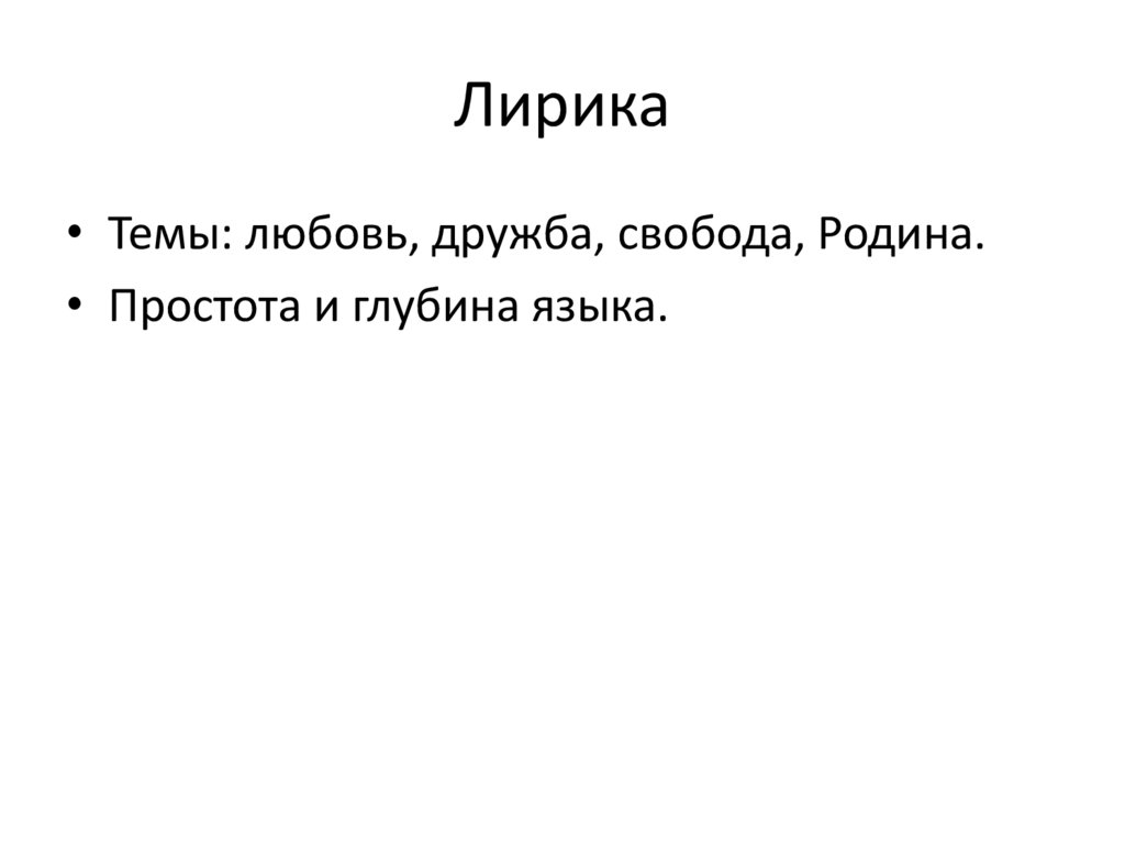 Лирика• Темы: любовь, дружба, свобода, Родина.