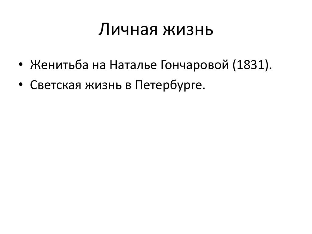 Личная жизнь• Женитьба на Наталье Гончаровой (1831).