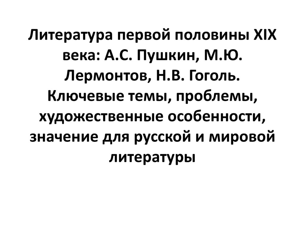 1. Литература первой половины XIX века: А.С. Пушкин, М.Ю. Лермонтов, Н.В. Гоголь. Ключевые темы, проблемы, художественные
