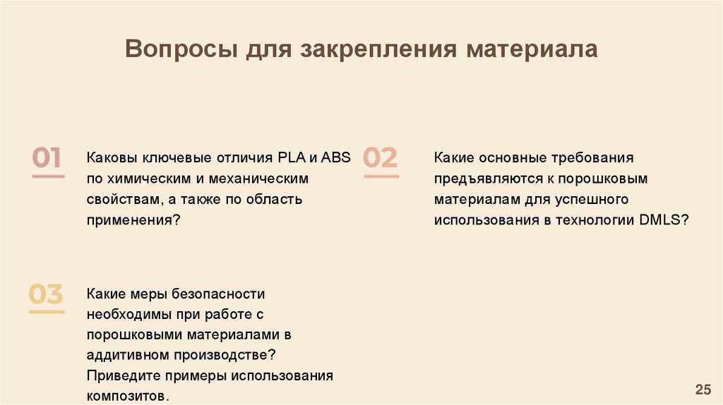 Вопросы для закрепления материалаКаковы ключевые отличия PLA и ABS