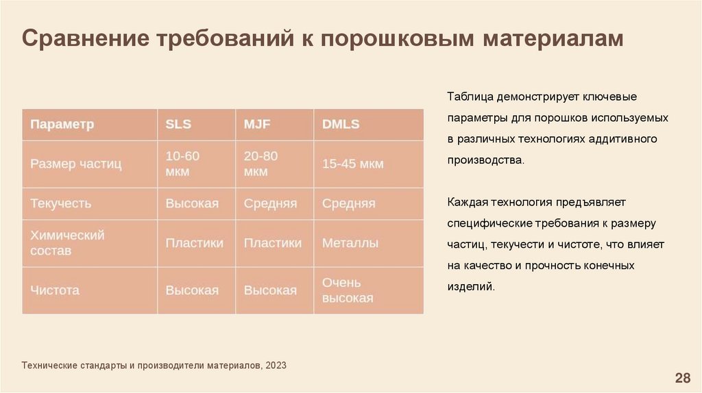 Сравнение требований к порошковым материаламТаблица демонстрирует ключевые
