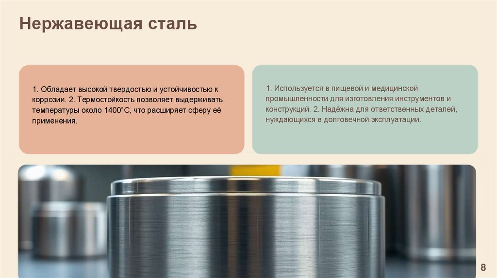 Нержавеющая сталь1. Обладает высокой твердостью и устойчивостью к
