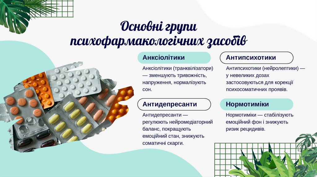 Серед методів фармакологічної корекції психосоматичних розладів важливе місце займають