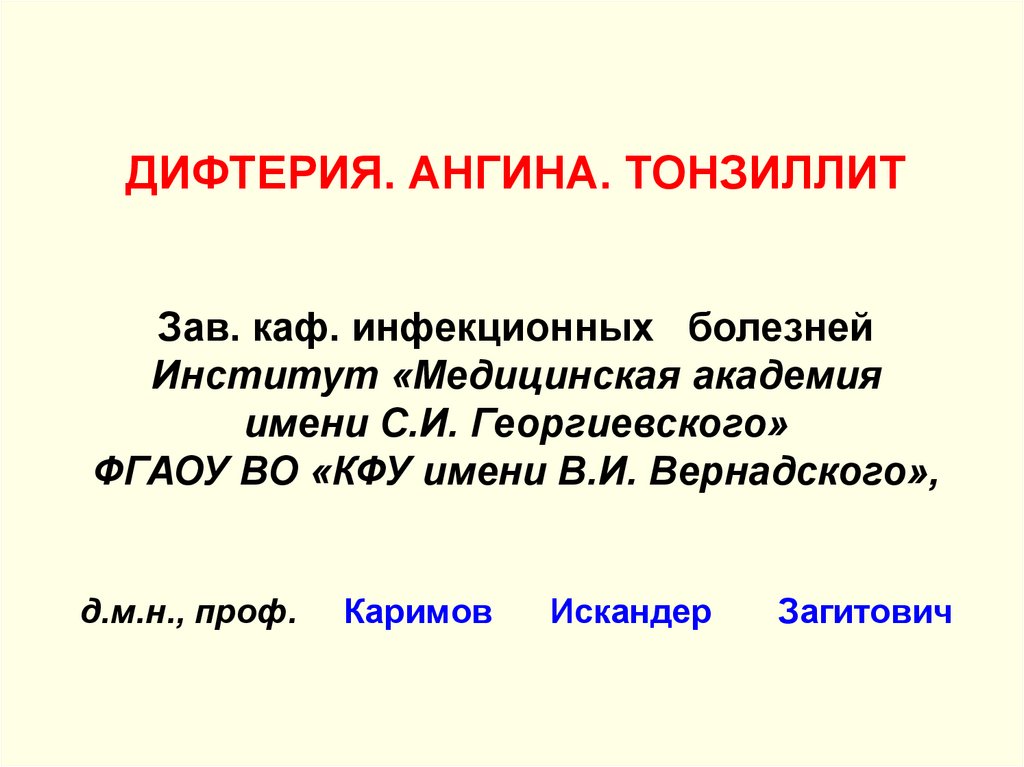 1. ДИФТЕРИЯ. АНГИНА. ТОНЗИЛЛИТ Зав. каф. инфекционных болезней Институт «Медицинская академия имени С.И. Георгиевского» ФГАОУ ВО