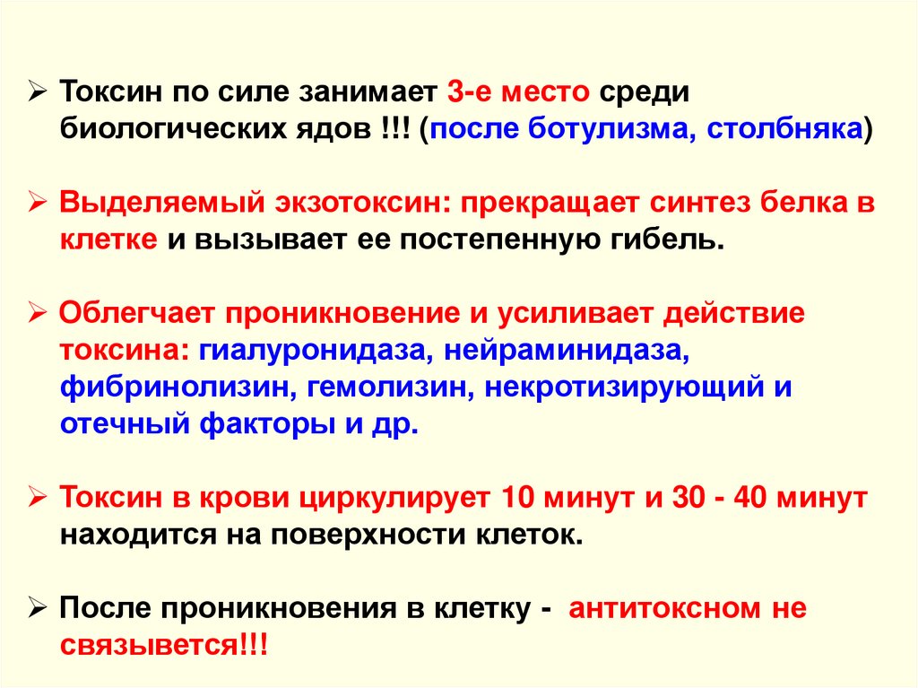 Токсин по силе занимает 3-е место средибиологических ядов !!! (после ботулизма, столбняка)