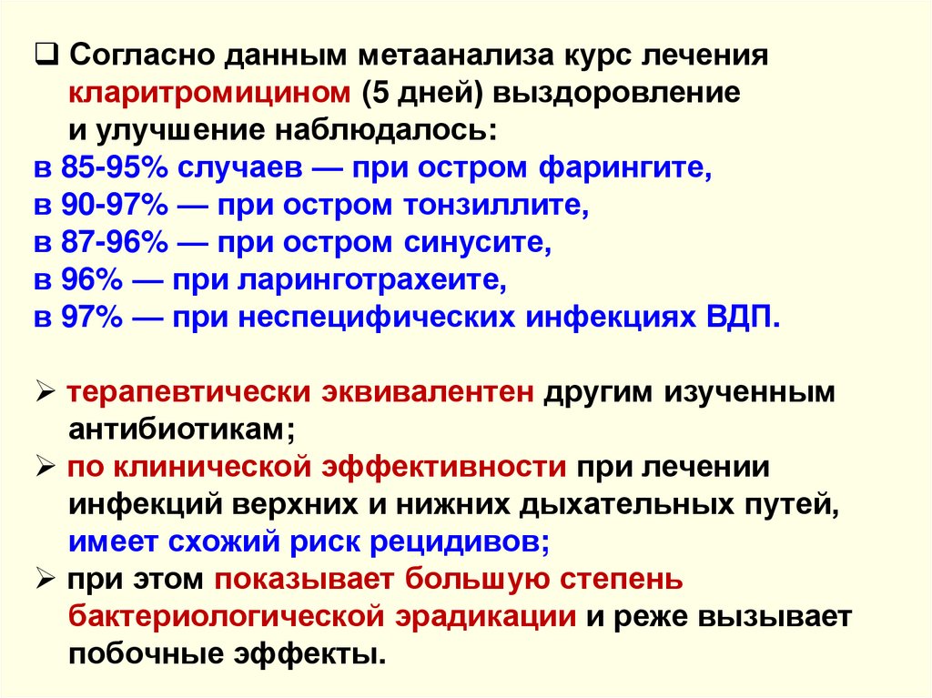 Согласно данным метаанализа курс лечениякларитромицином (5 дней) выздоровление