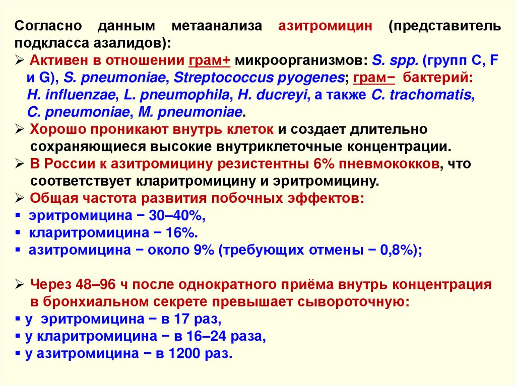 Согласно данным метаанализа азитромицин (представительподкласса азалидов):