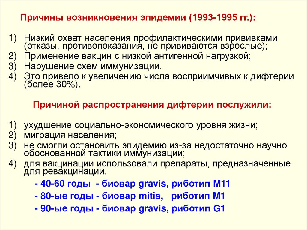 Причины возникновения эпидемии (1993-1995 гг.):1) Низкий охват населения профилактическими прививками