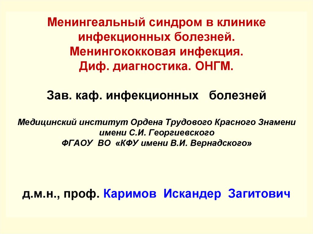 1. Менингеальный синдром в клинике инфекционных болезней. Менингококковая инфекция. Диф. диагностика. ОНГМ. Зав. каф. инфекционных