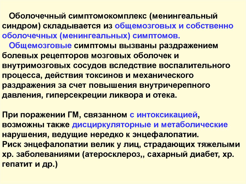 Оболочечный симптомокомплекс (менингеальныйсиндром) складывается из общемозговых и собственно