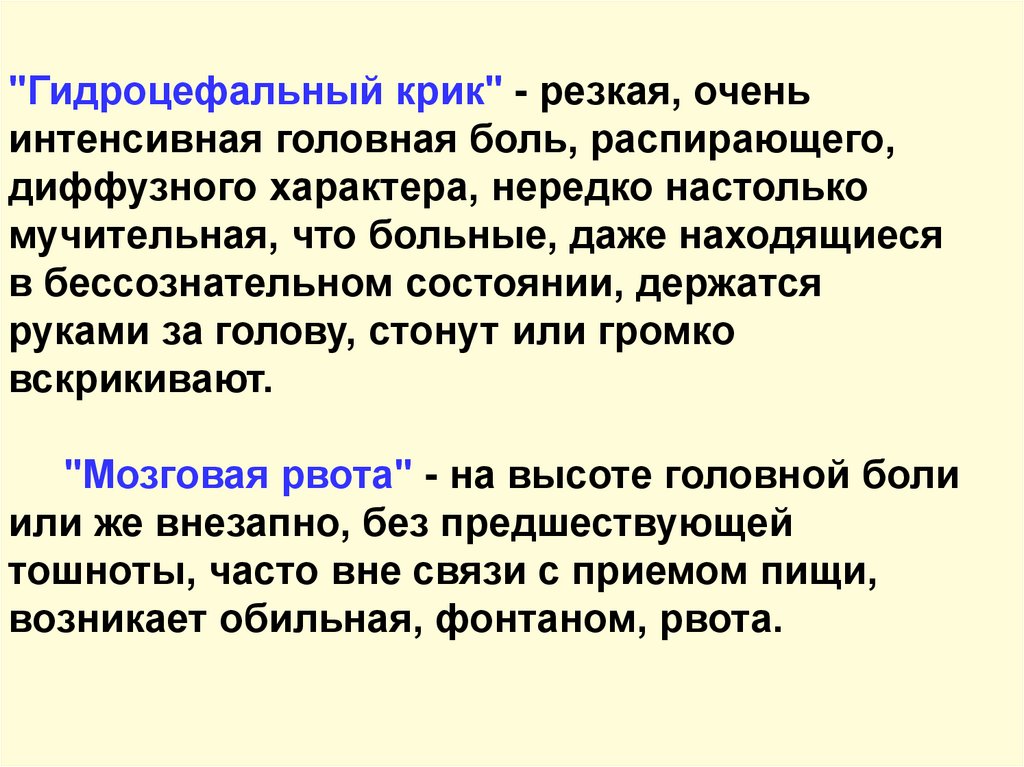"Гидроцефальный крик" - резкая, оченьинтенсивная головная боль, распирающего,