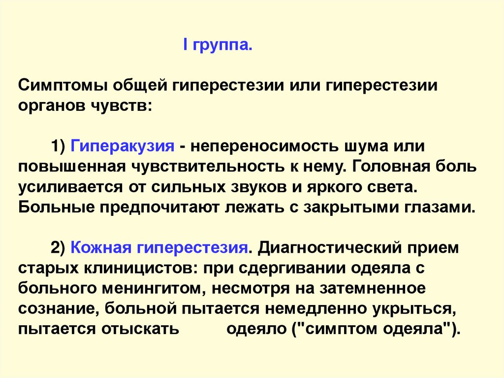 I группа.Симптомы общей гиперестезии или гиперестезии