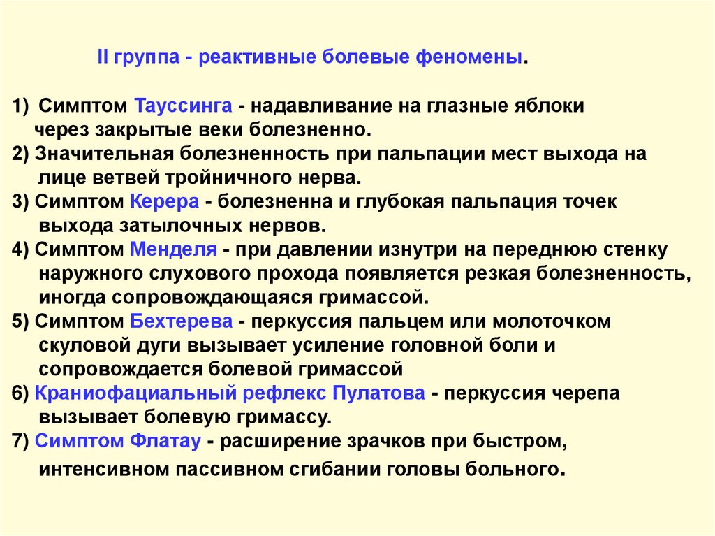 II группа - реактивные болевые феномены.1) Симптом Тауссинга - надавливание на глазные яблоки