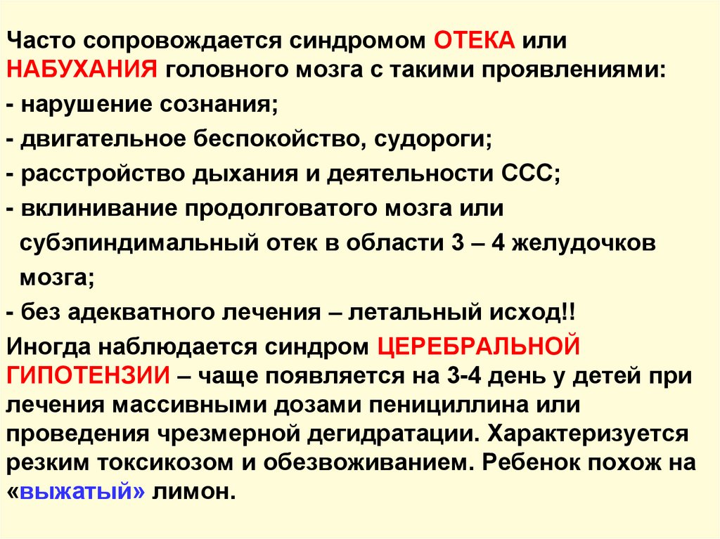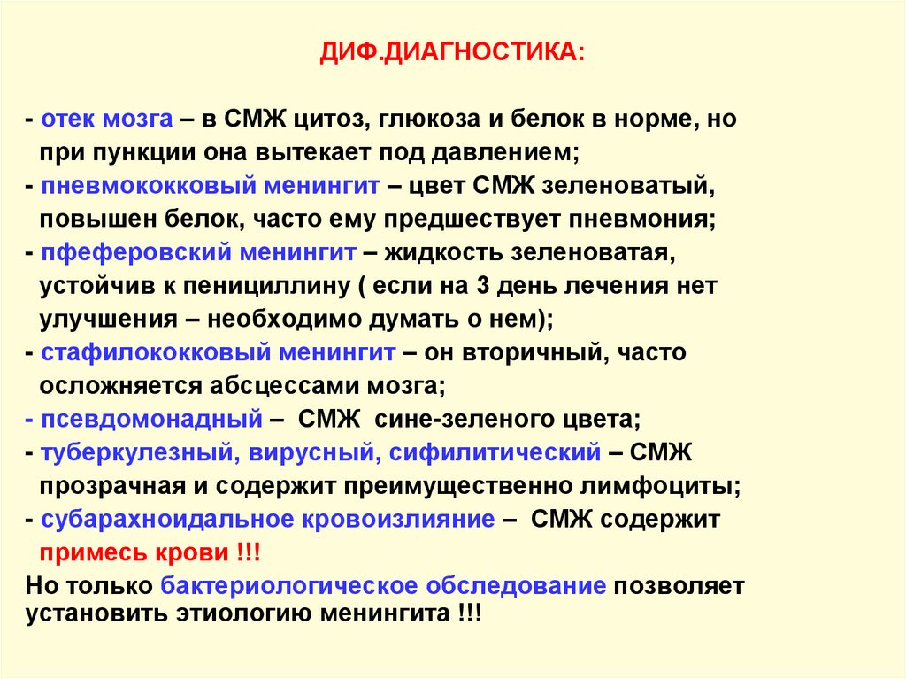 ДИФ.ДИАГНОСТИКА:- отек мозга – в СМЖ цитоз, глюкоза и белок в норме, но