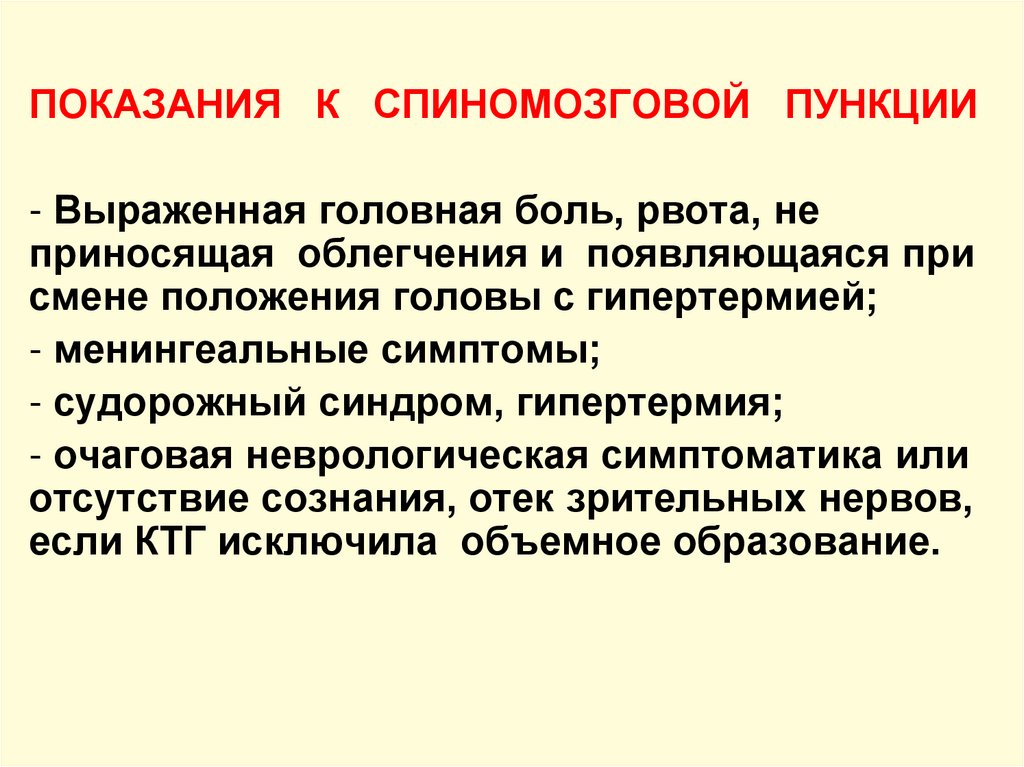 ПОКАЗАНИЯ К СПИНОМОЗГОВОЙ ПУНКЦИИ- Выраженная головная боль, рвота, не