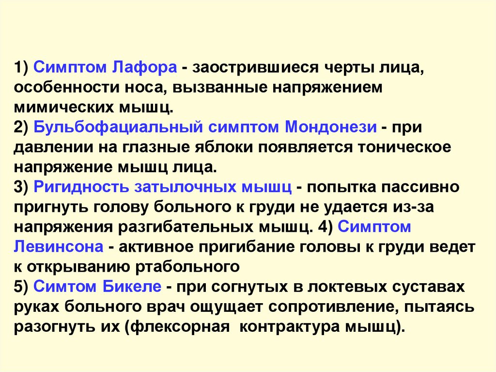 1) Симптом Лафора - заострившиеся черты лица,особенности носа, вызванные напряжением
