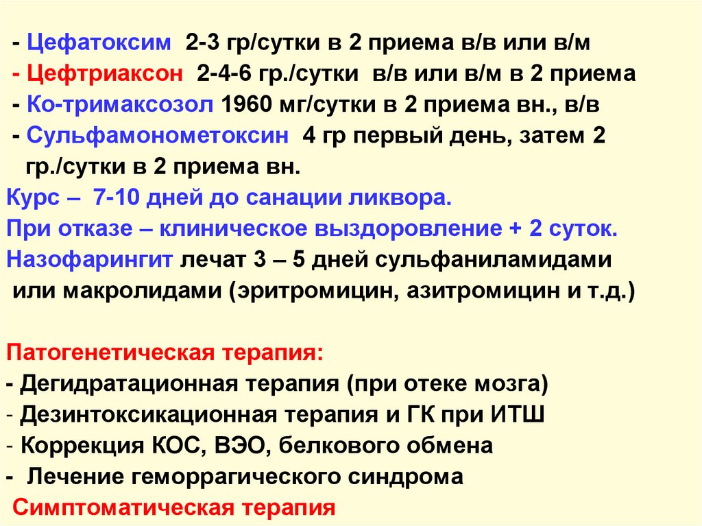 - Цефатоксим 2-3 гр/сутки в 2 приема в/в или в/м- Цефтриаксон 2-4-6 гр./сутки в/в или в/м в 2 приема