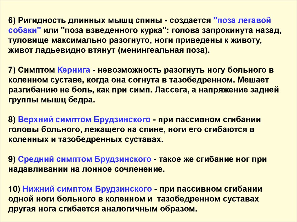 7) Симптом Кернига - невозможность разогнуть ногу больного в