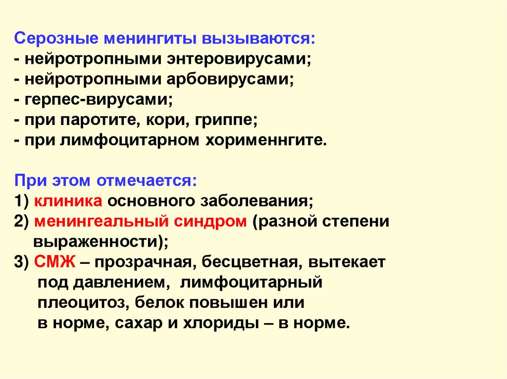 - туберкулезный, вирусный, сифилитический – СМЖ