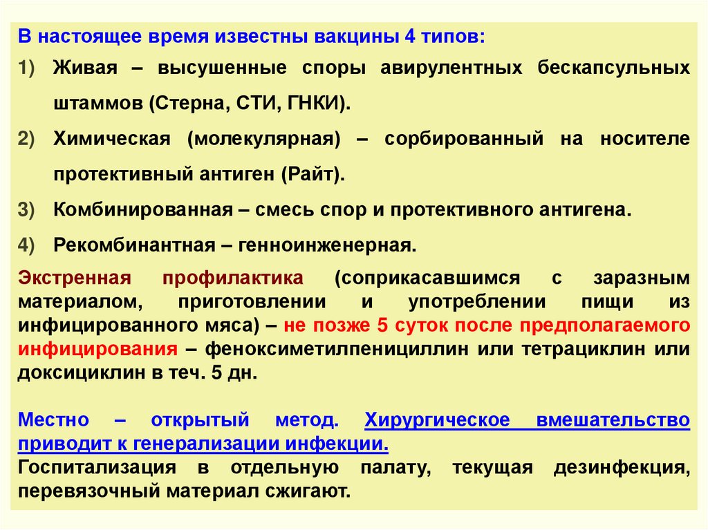 В настоящее время известны вакцины 4 типов:1) Живая – высушенные споры авирулентных бескапсульных